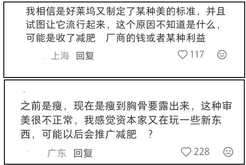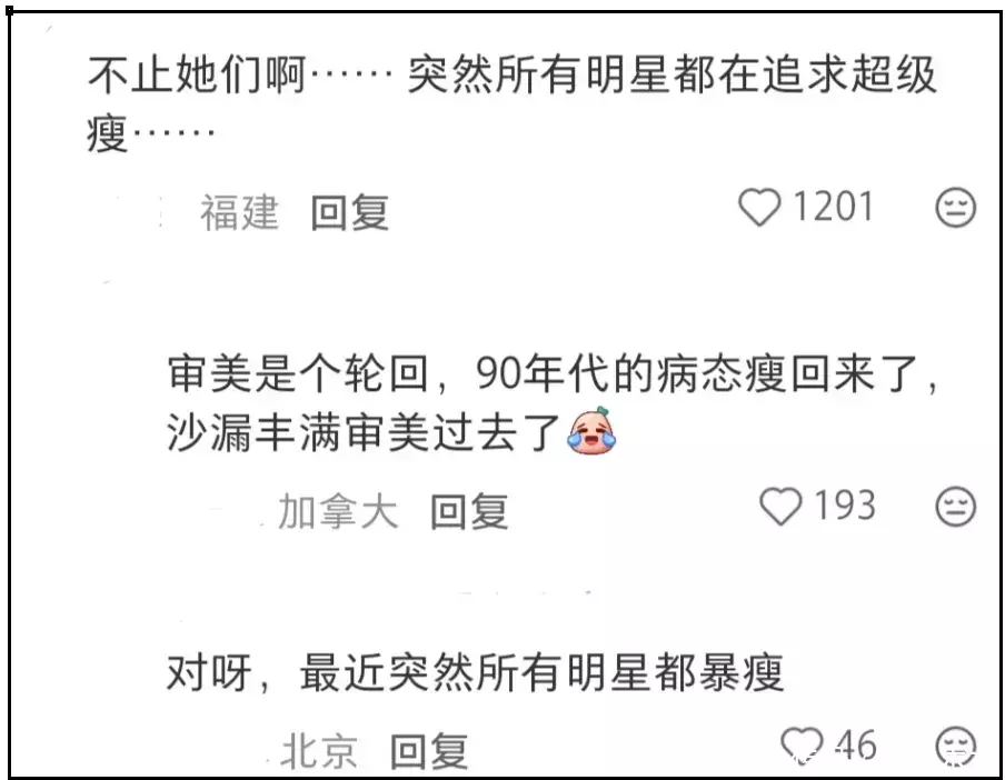 在网友看来,如果只是几个明星瘦了,还有可能是出于个人原因减肥,但全球娱乐圈都莫名呈现同一种趋势,就更像是审美引导了。