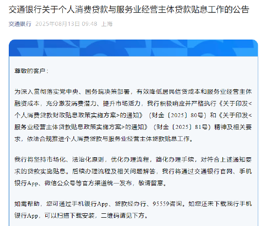 8月13日金融一线消息,交通银行发布关于个人消费贷款与服务业经营主体贷款贴息工作的公告。公告称,交通银行积极响应并严格执行《关于印发<个人消费贷款财政贴息政策实施方案>的通知》(财金〔2025〕80号)和《关于印发<服务业经营主体贷款贴息政策实施方案>的通知》(财金〔2025〕81号)精神及相关要求,依法合规推进个人消费贷款与服务业经营主体贷款贴息工作。